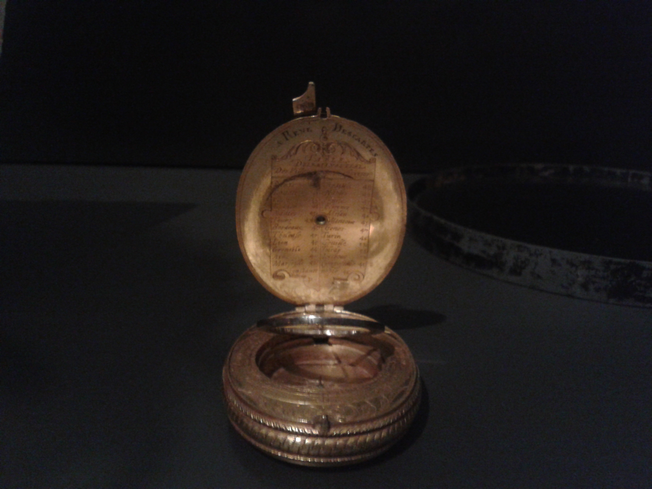 Descartes’ nocturlabe – a nocturnal watch – is on display at the Rijks Museum, Amsterdam. It is an exquisite object, beautifully engraved, and small enough to fit into the palm of your hand. The nocturlabe contains a sundial and a compass. Inside the lid, and just visible, a list of cities (many of them French) and their longitude. This was a way to tell the time, and could be used at night as well as during the day. Crucially, it was portable, and could be attached by a chain to a buttonhole and slipped into a pocket.
